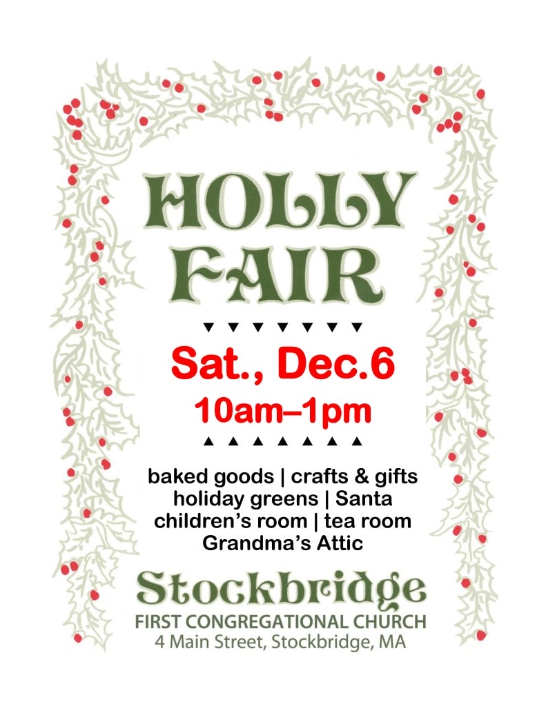 Our annual Holly Fair features hand-made crafts and decorations, holiday greens, baked goods, Grandma’s Attic, Santa Claus, tea room, children’s room and more. All proceeds to charity.