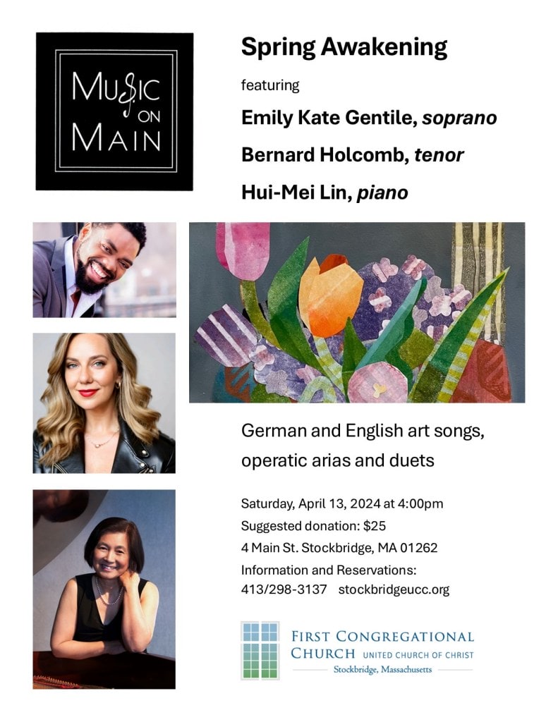 Music on Main presents Spring Awakening, an afternoon of poetry and song, on Saturday April 13 at 4 pm at The First Congregational Church, 4 Main Street in Stockbridge.