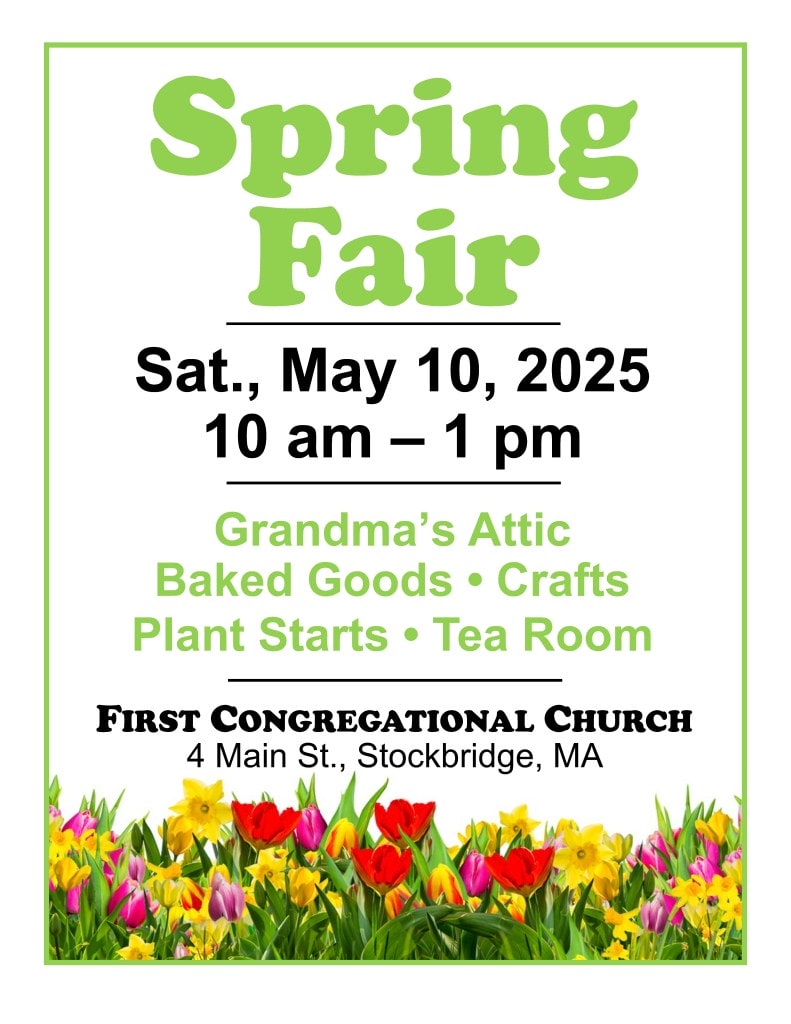 The Service League is looking for volunteers to help during our Spring Fair. Even one hour is a huge help for us. Also, we are looking for donations of baked goods. We are asking for food to be individually wrapped so it’s easy to grab and eat on the go – cookies, muffins, brownies, bars, etc. No pies, cakes, or nuts please. Goodies can be dropped off at the Church from 9:45-10:00 a.m. that morning. Thank you and if you have any questions, please contact the church at office@stockbridgeucc.org