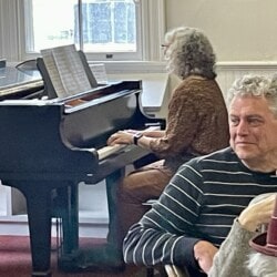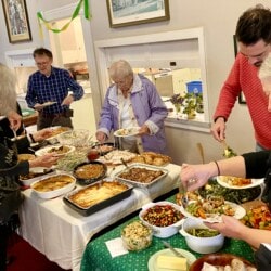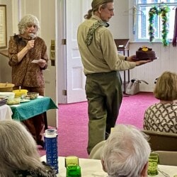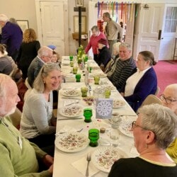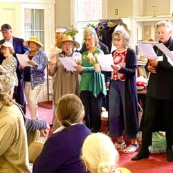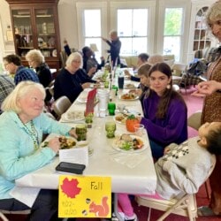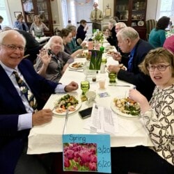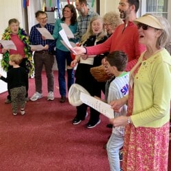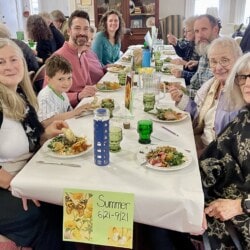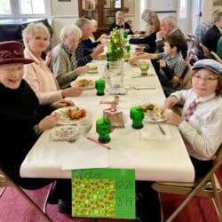 On May 5th we gathered for our All Church Party. A dreary day outside, it was jubilant inside with good food, good fun, and good fellowship. We gathered at seasonal tables and partook in an amazing potluck lunch followed by entertainment. Each table devised a seasonal song and, bedecked with appropriate costuming and props, serenaded the rest of us. Were we in tune? Not always, but we were fabulous.