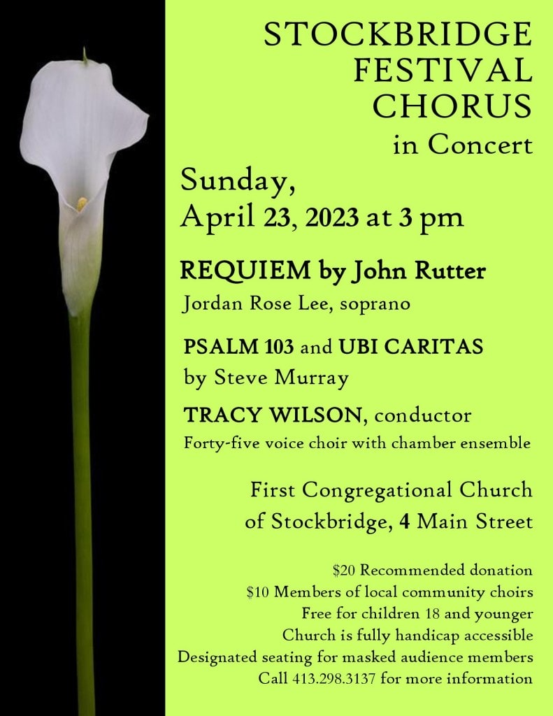 The 50-voice Stockbridge Festival Chorus is presenting its Spring concert at The First Congregational Church of Stockbridge located at 4 Main Street. The main selection is John Rutter’s Requiem, Jordan Rose Lee, soprano soloist, and two additional pieces by local composer Steve Murray. SFC is conducted by Tracy Wilson, and the concert will be accompanied by organ, harp, cello, flute, oboe and percussion.